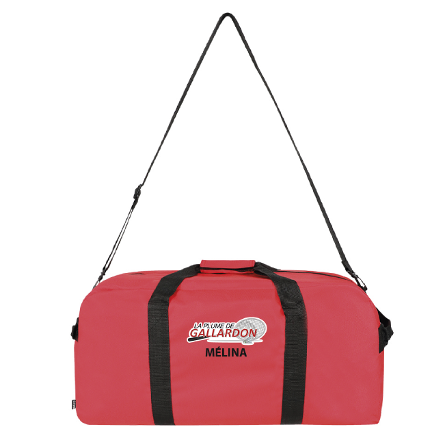 Sac fabriqué en polyester RPET 600D durable. Compartiment principal avec fermeture à double zip et poche extérieure avec tirette de fermeture éclair. Poignées renforcées autour du corps de couleur noire et poignée rembourrée assortie. Comprend une poignée latérale et une bandoulière réglable avec attache à double mousqueton.